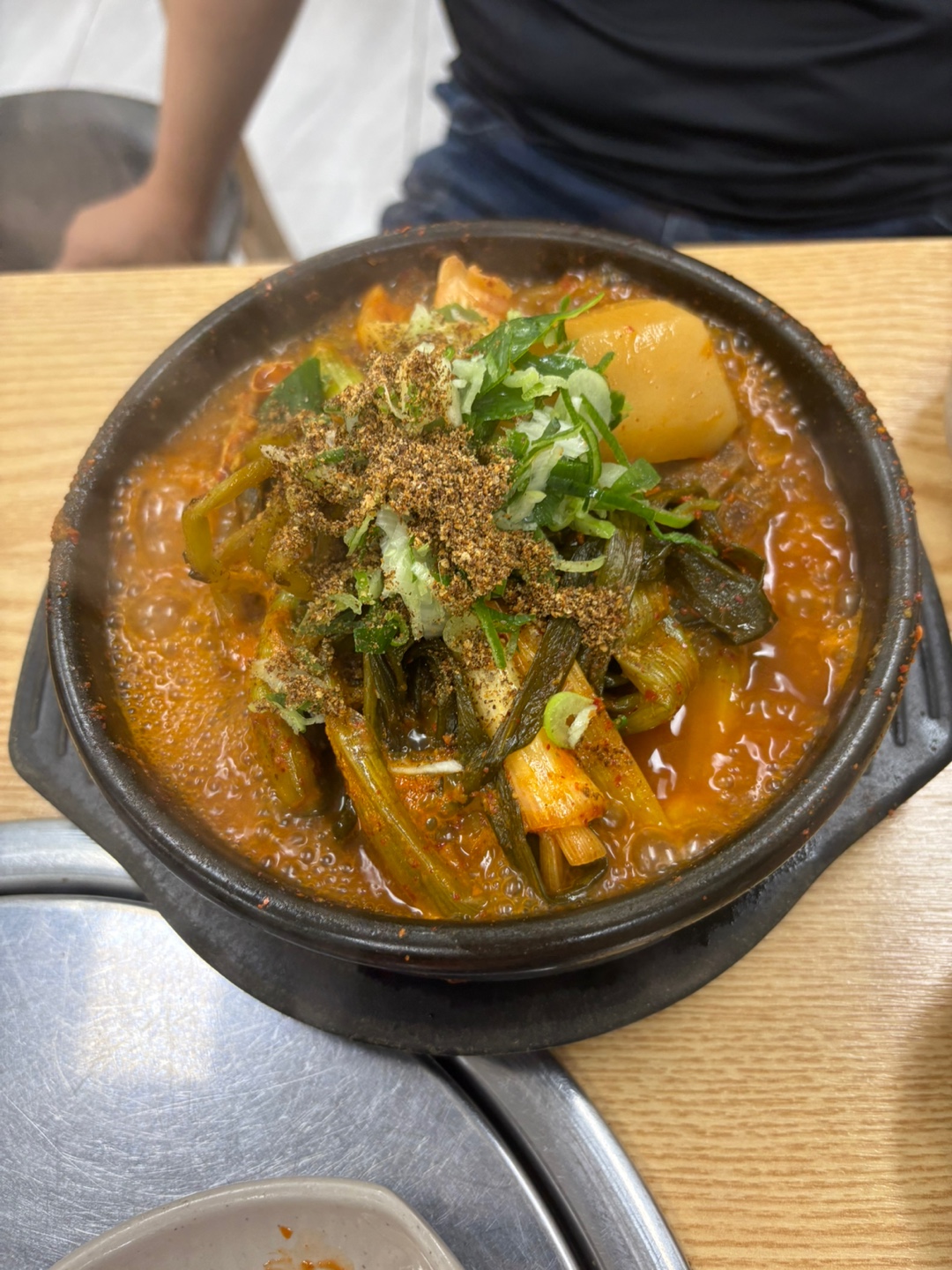 파김치와 총각김치가 들어가서 김치의 새콤함과 뼈해장국위 진한 국물이 잘 어우러져