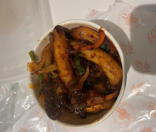 떡, 순대, 야채 이 세 가지를 양념을 넣어 기름에 볶았네요~