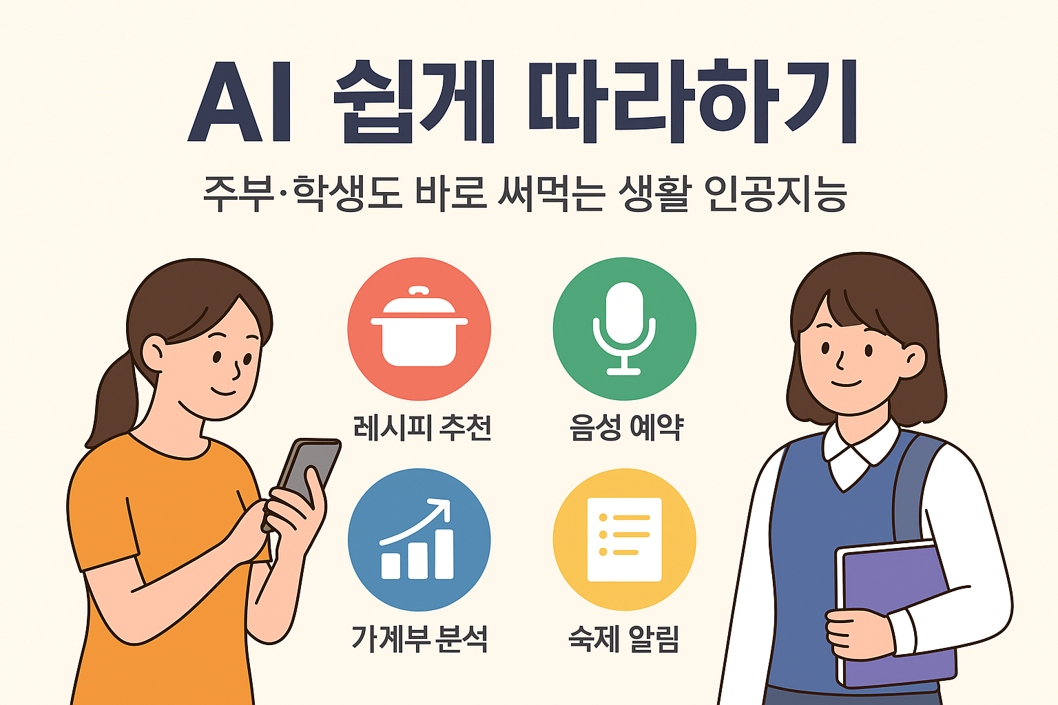 요즘 ‘AI’라는 말 많이 들리시죠? 어렵게만 느껴졌던 인공지능을 이제는 집안일·공부·생활 곳곳에서 쉽게 활용할 수 있어요. 정부·기업의 투자 확대 덕분에 관련 서비스도 빠르게 늘어나고 있답니다. 주부·학생도 바로 시작할 수 있는 생활 속 AI 활용법을 소개해 드립니다.